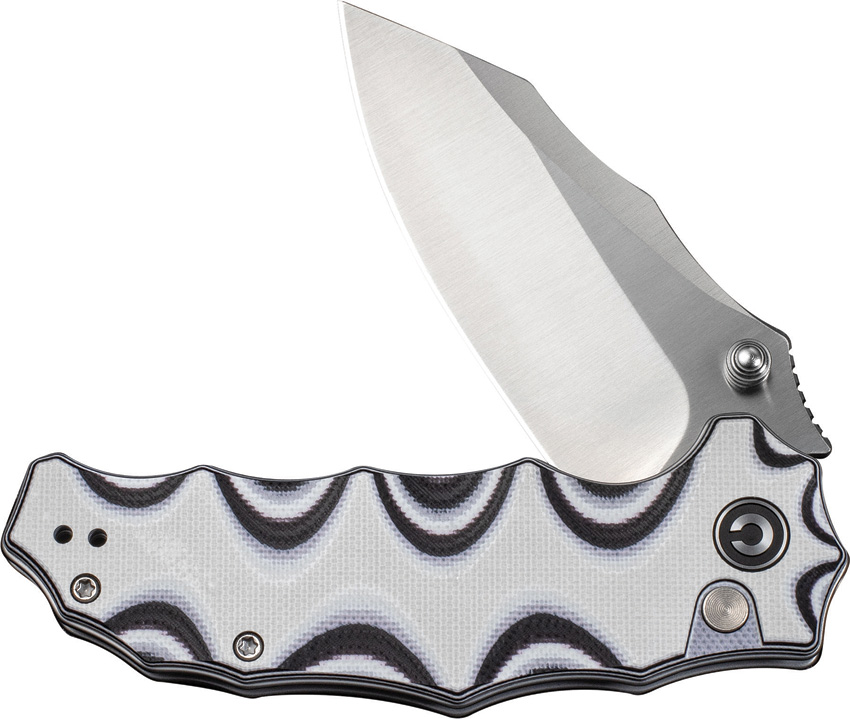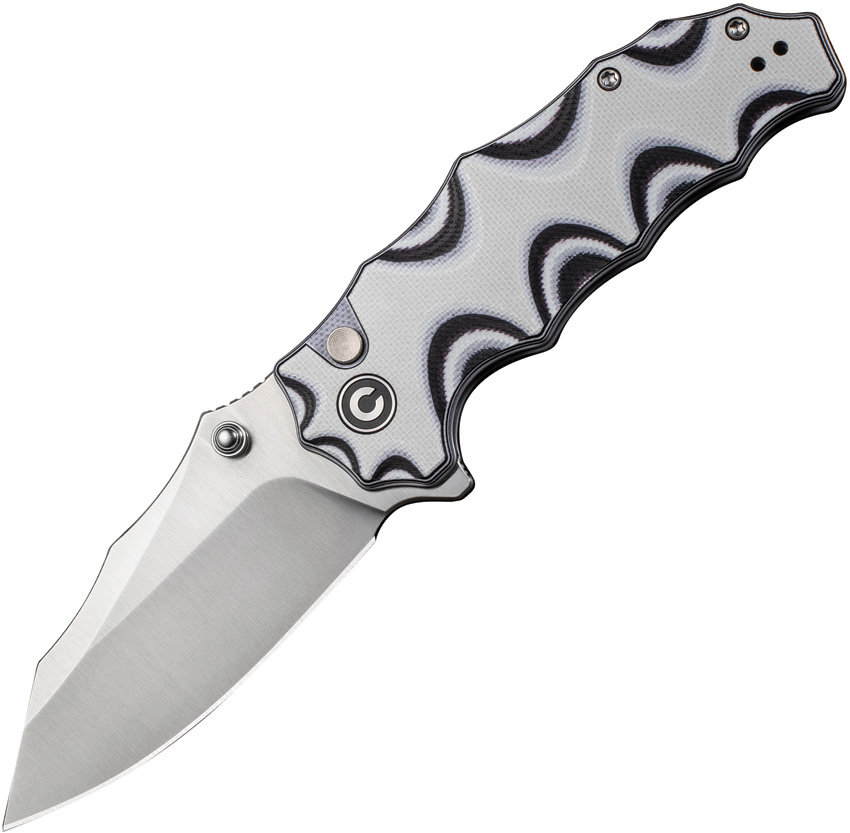 4.25″ (10.8cm) closed. 3.25″ (8.26cm) satin finish 14C28N Sandvik stainless clip point blade. Black and white sculpted G10 handle. Thumb stud. Extended tang. Pocket clip. Boxed. Sales Restriction: No Amazon.com Sales.