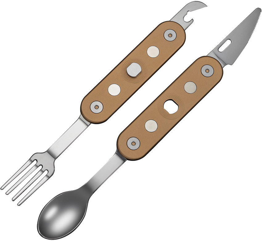 4.38″ closed. Coyote brown aluminum handle. Stainless knife, fork, spoon, and can opener. Tools nest with magnets. Canvas pouch. Boxed.