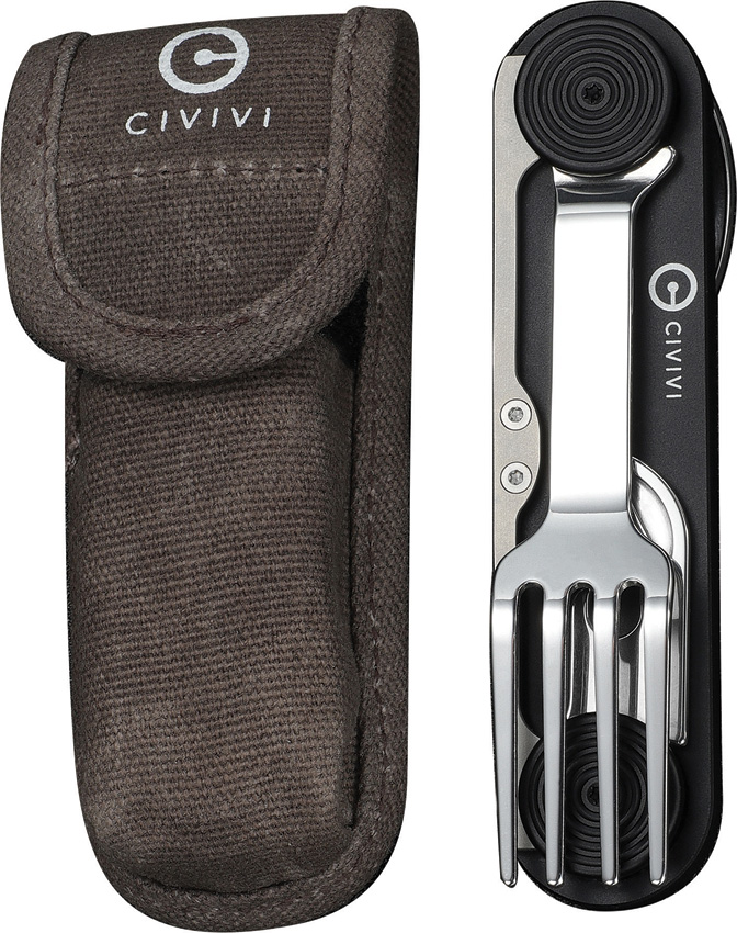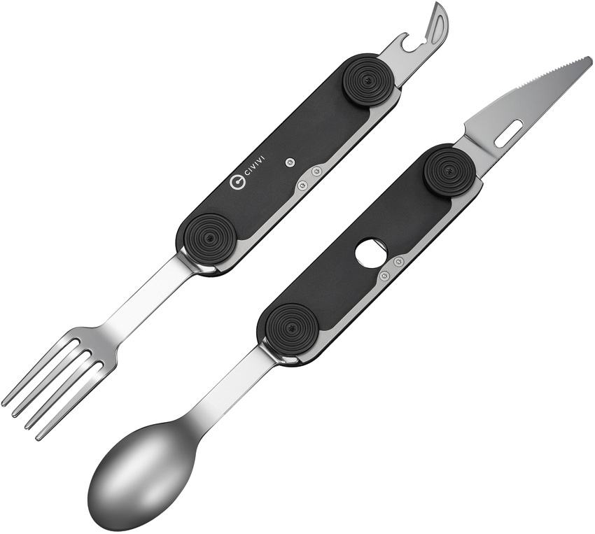 4.38″ closed. Black aluminum handle. Stainless knife, fork, spoon, and can opener. Tools nest with magnets. Canvas pouch. Boxed.