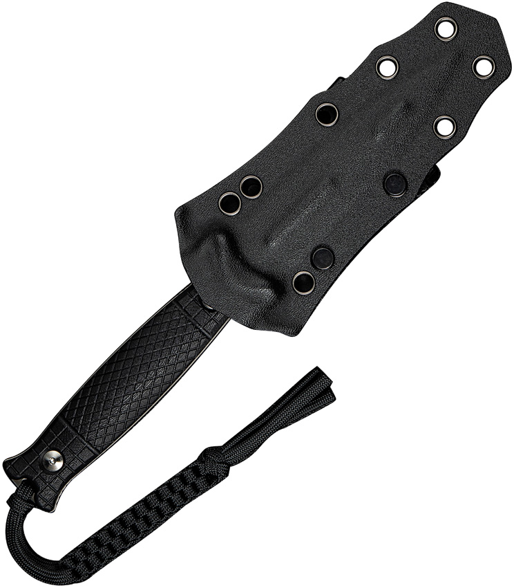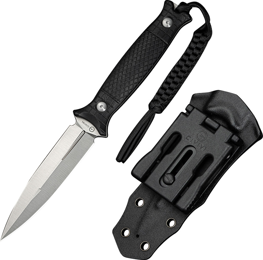 9.25″ (23.5cm) overall. 4.5″ (11.43cm) satin finish double edge 14C28N Sandvik stainless dagger blade. Black G10 handle. Full tang. Lanyard hole. Braided cord lanyard. Black Kydex belt sheath.