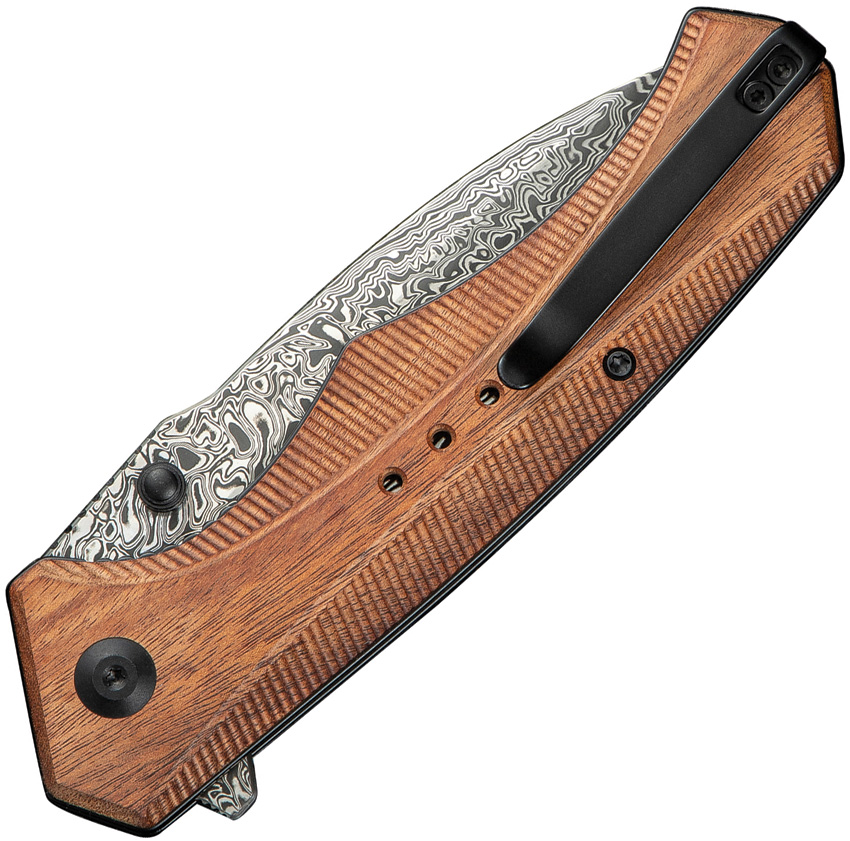 5.25″ (13.34cm) closed. 3.75″ (9.53cm) Damascus steel drop point blade. Brown wood handle. Extended tang. Thumb stud. Pocket clip. Black nylon zippered storage case. Boxed. Sales Restriction: No Amazon.com Sales.