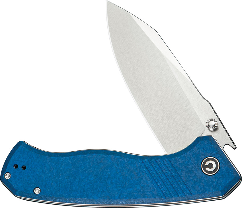 5″ (12.7cm) closed. 3.75″ (9.53cm) satin finish 14C28N Sandvik stainless clip point blade. Blue shredded G10 handle. Extended tang. Thumb stud. Pocket clip. Black nylon zippered storage case. Boxed.