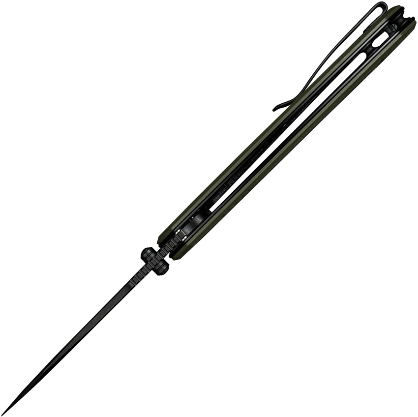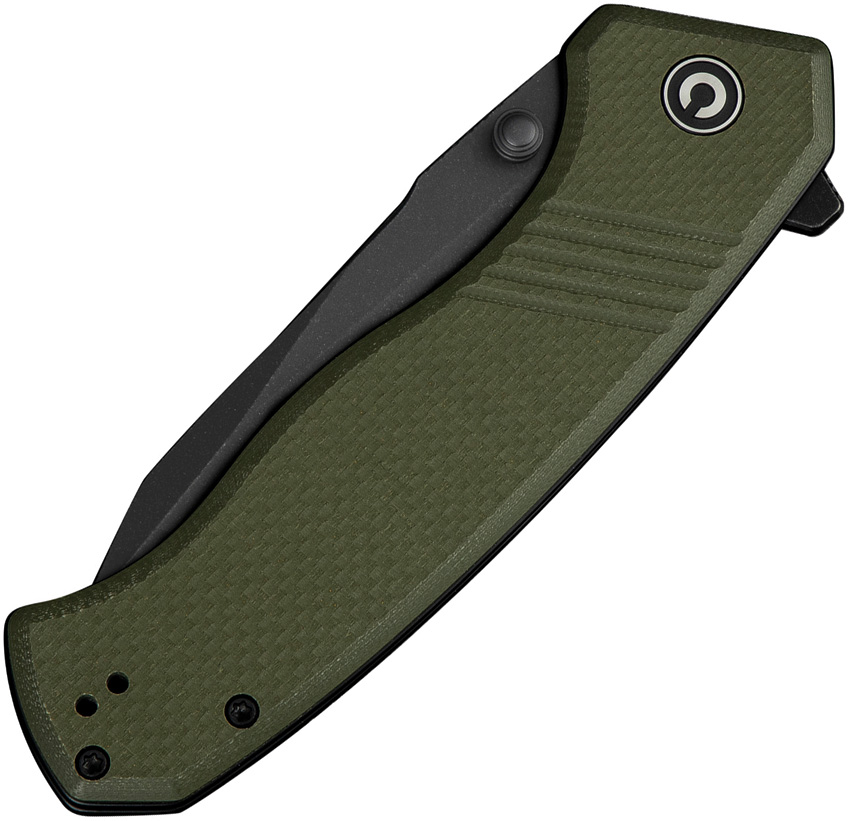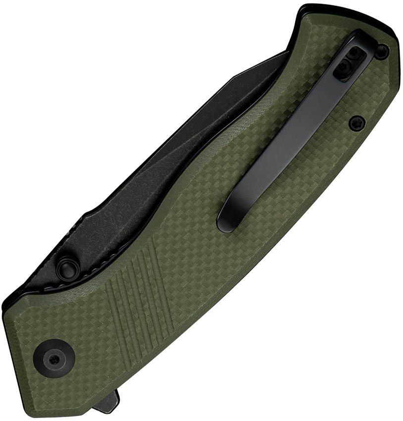 5″ (12.7cm) closed. 3.75″ (9.53cm) black stonewash finish 14C28N Sandvik stainless clip point blade. OD green textured G10 handle. Extended tang. Thumb stud. Pocket clip. Black nylon zippered storage case. Boxed.