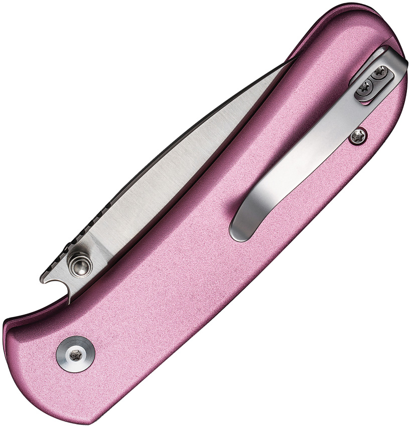 4″ (10.16cm) closed. 3″ (7.62cm) satin finish 14C28N Sandvik stainless blade. Pink aluminum handle. Thumb stud. Pocket clip. Black nylon zippered storage case. Boxed.