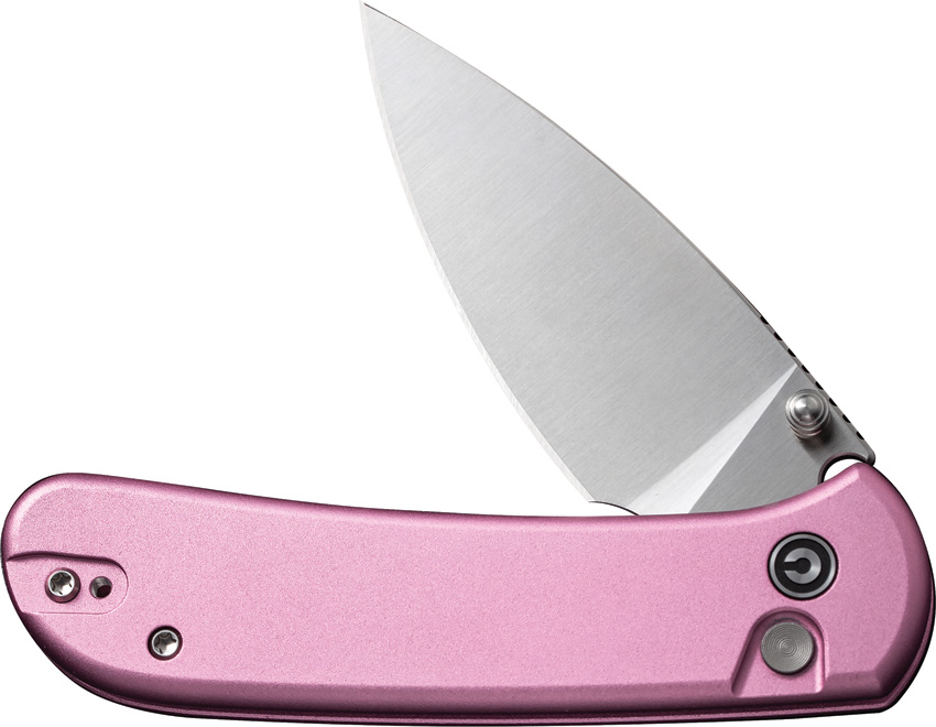 4″ (10.16cm) closed. 3″ (7.62cm) satin finish 14C28N Sandvik stainless blade. Pink aluminum handle. Thumb stud. Pocket clip. Black nylon zippered storage case. Boxed. Sales Restriction: No Amazon.com Sales.