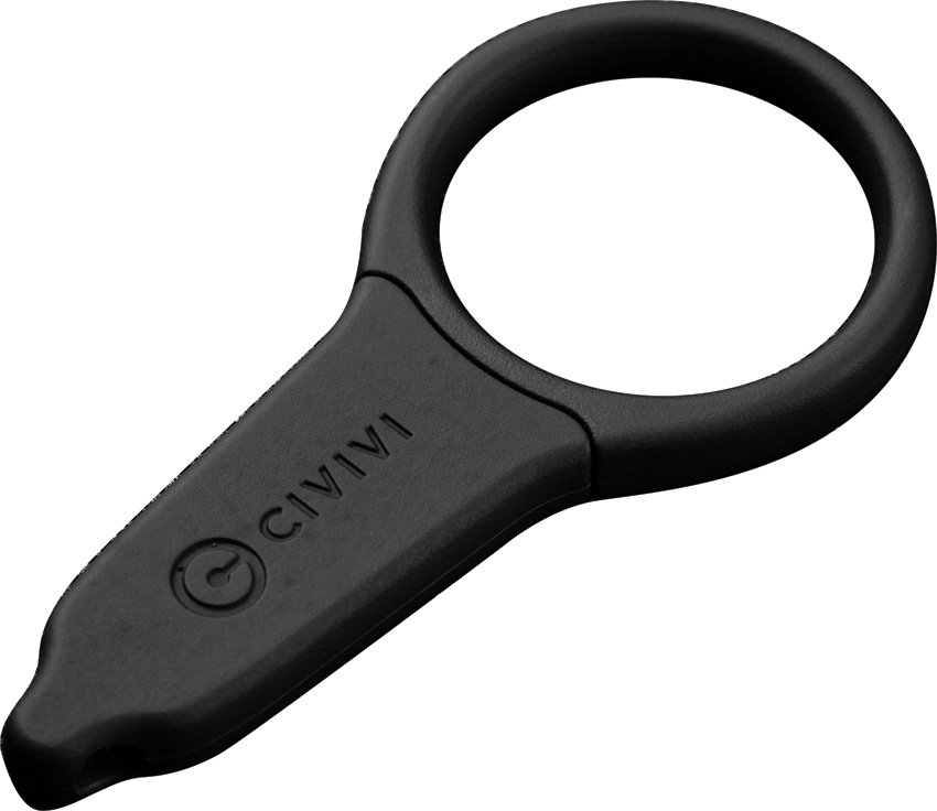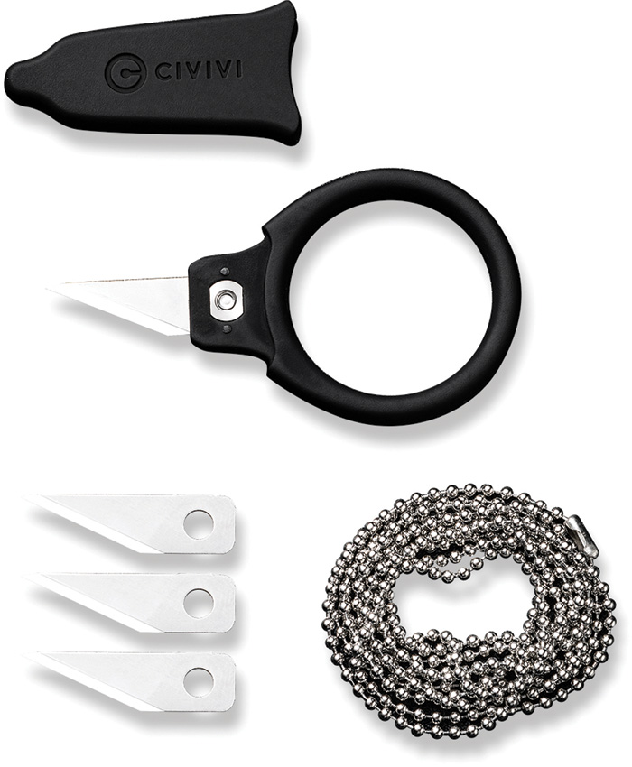 2.5″ (6.35cm) overall. 0.68″ (1.73cm) blade. Black rubberized ABS handle. Finger ring. Replaceable 6Cr13 stainless blade. Ball chain lanyard. Includes three replaceable blades. Black ABS sheath. Boxed.