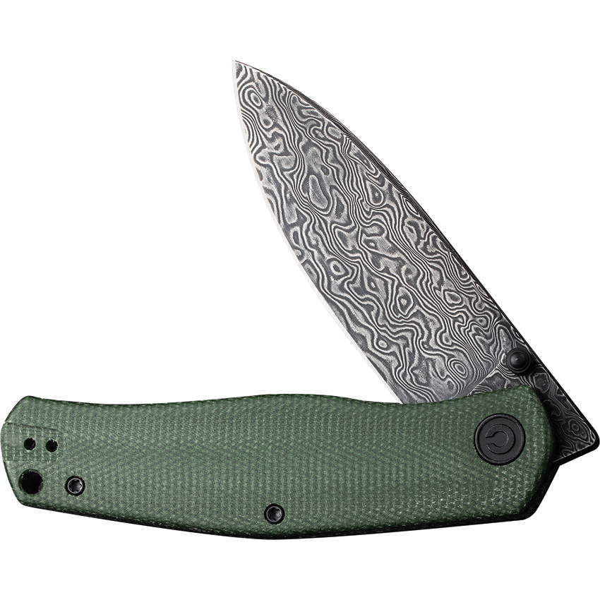 4.38″ (11.13cm) closed. 3.38″ (8.59cm) Damascus steel blade. Green canvas micarta handle. Extended tang. Lanyard hole. Pocket clip. Thumb stud. Black nylon zippered storage case. Boxed.