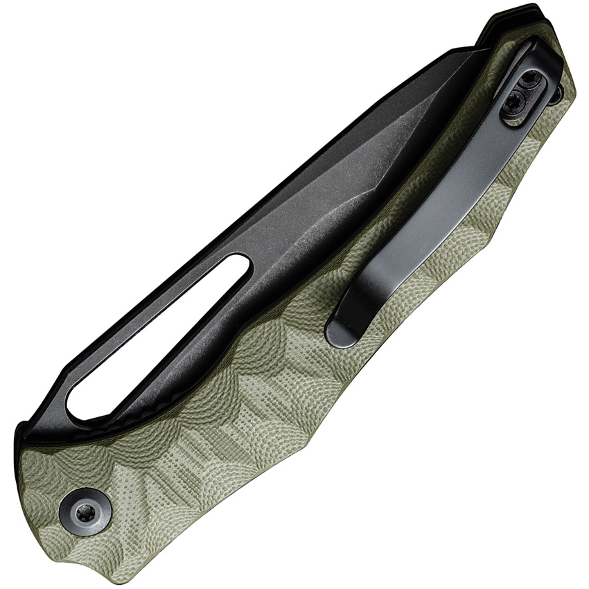 4.25″ (10.8cm) closed. 3.5″ (8.89cm) black stonewash finish 14C28N Sandvik stainless blade. OD green sculpted G10 handle. Thumb pull. Pocket clip. Black nylon zippered storage case. Boxed.