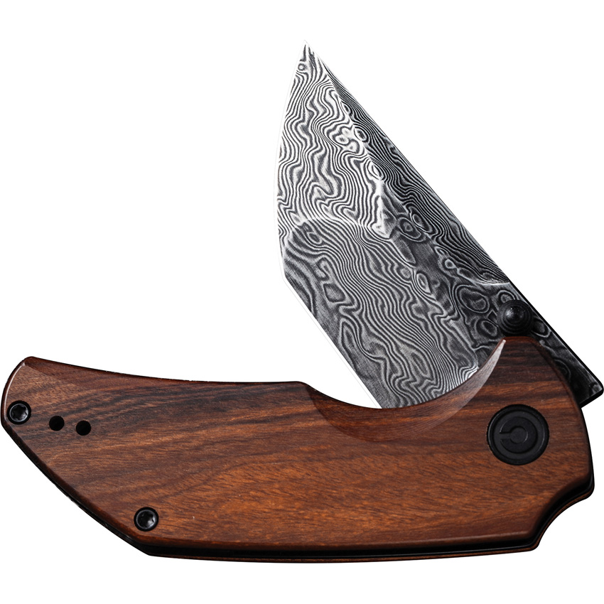 3.75″ (9.53cm) closed. 2.75″ (6.99cm) Damascus steel tanto blade. Brown wood handle. Thumb stud. Pocket clip. Black nylon zippered storage case. Boxed.