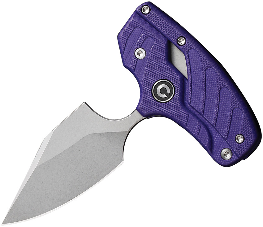 6.25″ (15.88cm) overall. 2.25″ (5.72cm) stonewash finish false edge 14C28N Sandvik stainless dagger blade. Purple G10 handle. Adjustable folding push dagger. Black leather belt sheath. Boxed.
