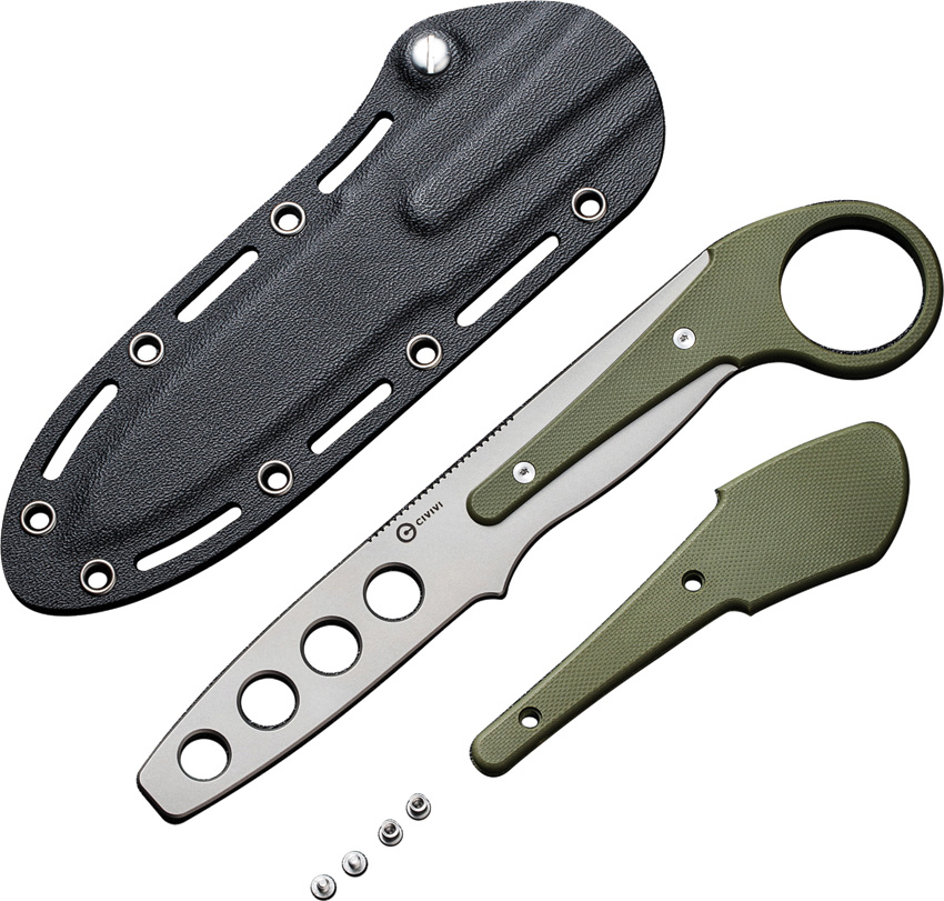 7.38″ (18.75cm) overall. 3.25″ (8.26cm) satin finish unsharpened D2 tool steel blunt tip blade. Green G10 handle. Finger ring. Comes with extra conventional handle. Black Kydex belt sheath. Boxed.