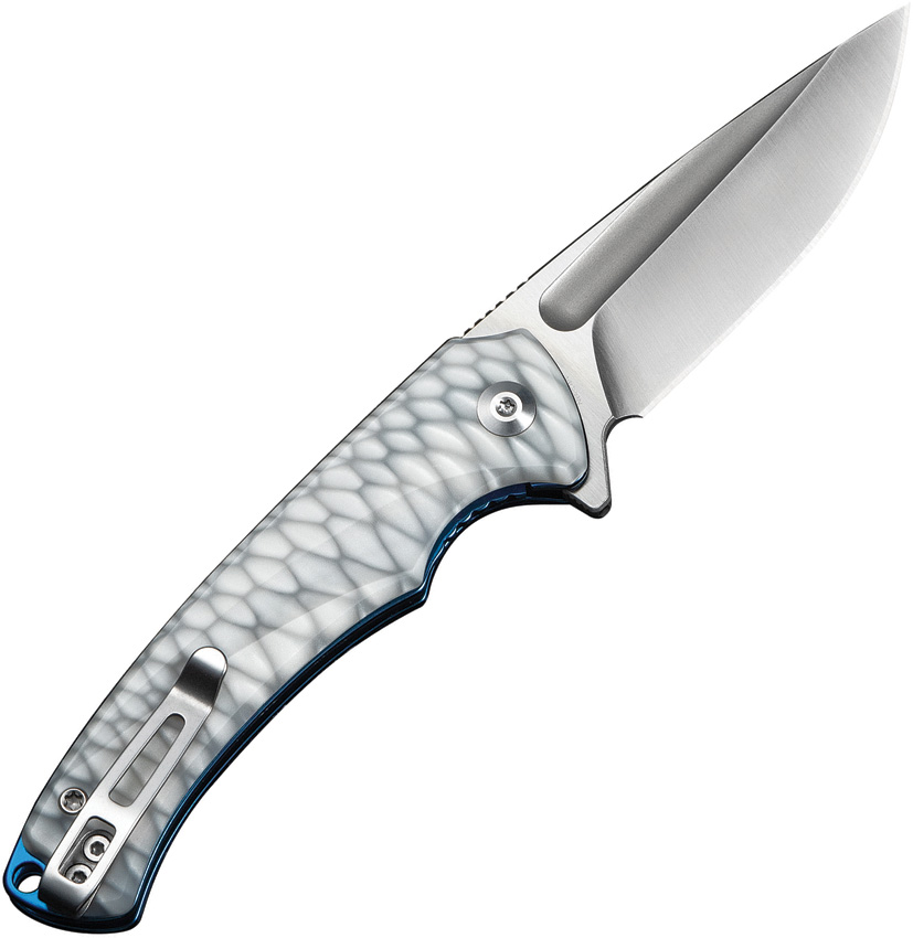 4.13″ (10.49cm) closed. 3″ (7.62cm) satin finish 14C28N Sandvik stainless drop point blade. White and gray resin handle. Extended tang. Lanyard hole. Pocket clip. Blue liners. Black nylon zippered storage case. Boxed.