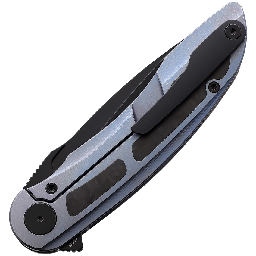 4.75″ (12.07cm) closed. 3.75″ (9.53cm) black coated Bohler M390 stainless blade. Blue titanium handle with carbon fiber inlay. Extended tang. Pocket clip. Black nylon zippered storage case. Boxed.