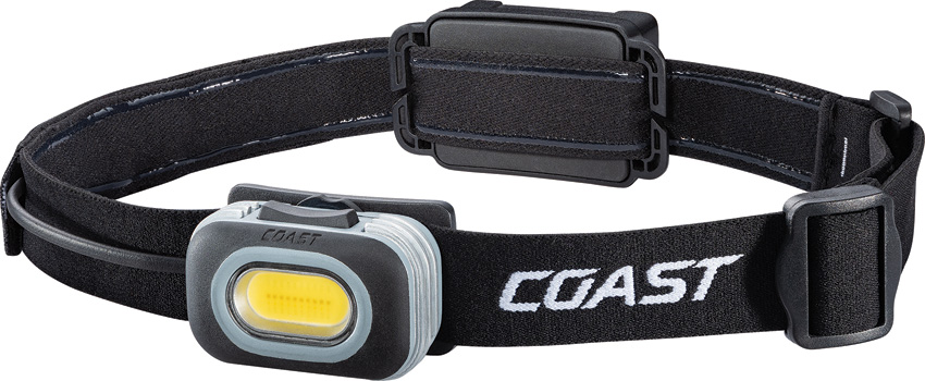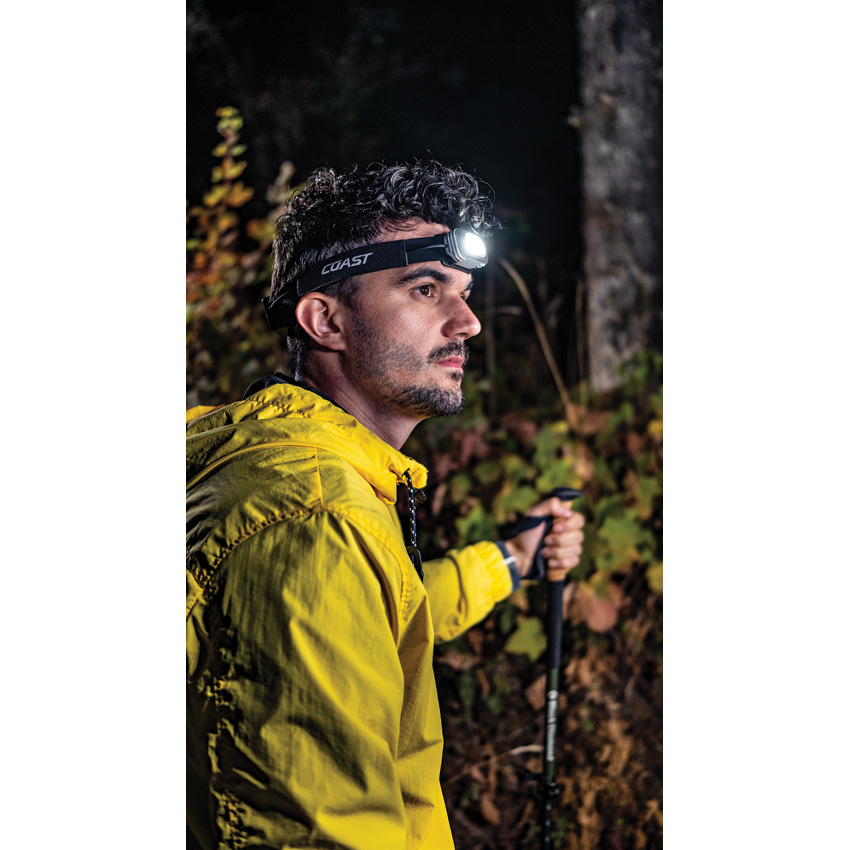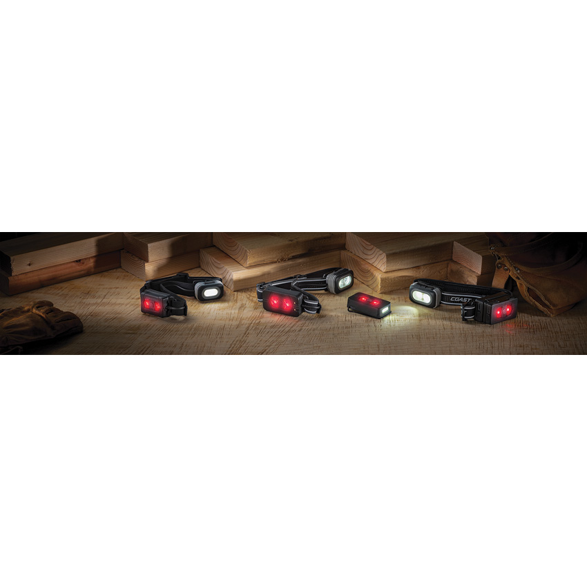 Modes: High (560 lumens, 2h runtime); Low (55 lumens, 14h runtime). C. O. B. Optic. 31m beam distance. Hinged beam. Light wheel control. Dual color white and red beam. Variable light control technology. One ZX350 battery (not included). Fixed beam system. Head strap. Requires (3) AAA batteries (included). Clam packed.