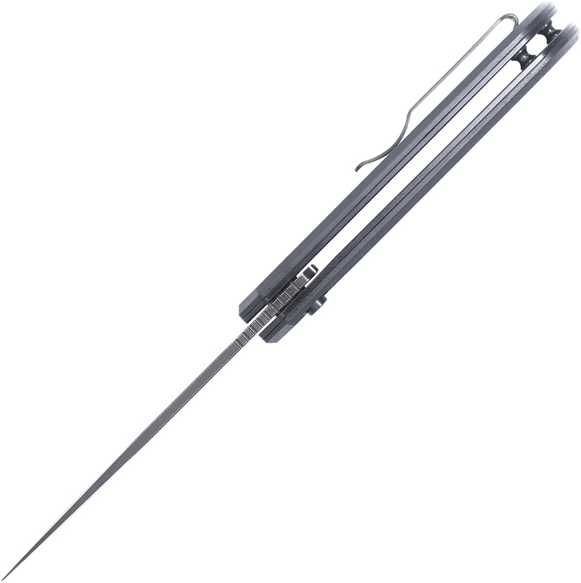 4.38″ (11.13cm) closed. 3.25″ (8.26cm) black stonewash finish D2 tool steel drop point blade. Black G10 handle. Pocket clip. Boxed.