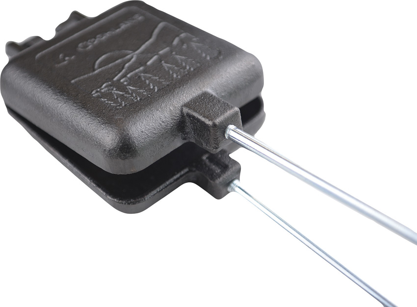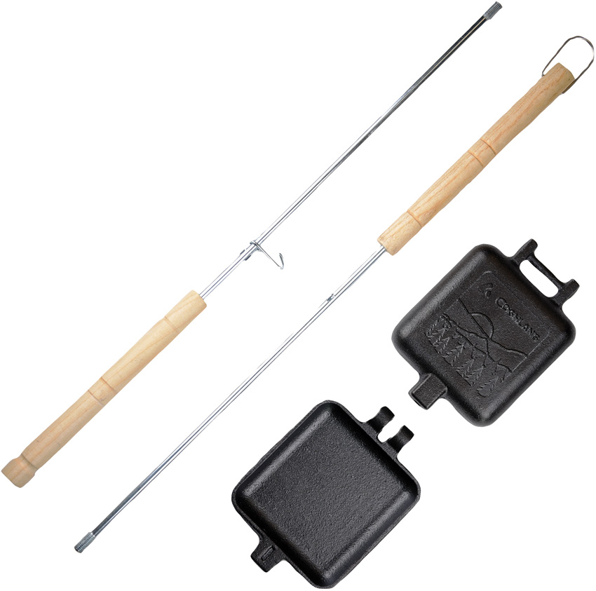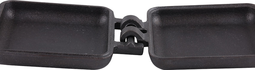 27″ overall. Weight: 3lb. Wood handle. Pre-seasoned cast iron. Reinforced hinge. Removable, stay-cool wood handles. S-clip locking mechanism.