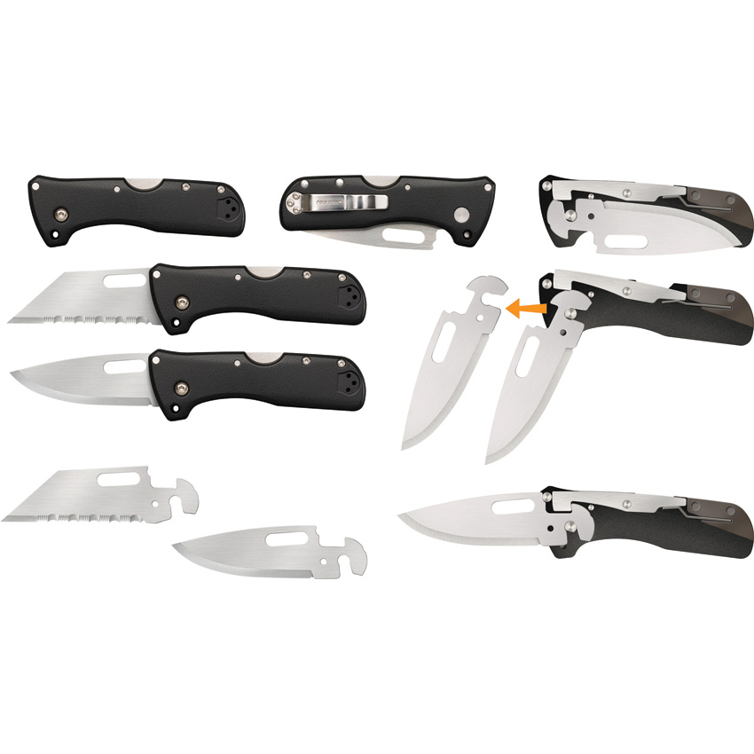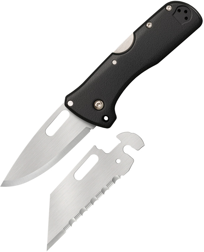 2.5″ (6.35cm) 420J2 stainless blade. Black ABS handle. Lanyard hole. Comes with bowie and serrated utility blades. Black ABS belt sheath. Hang packaged.