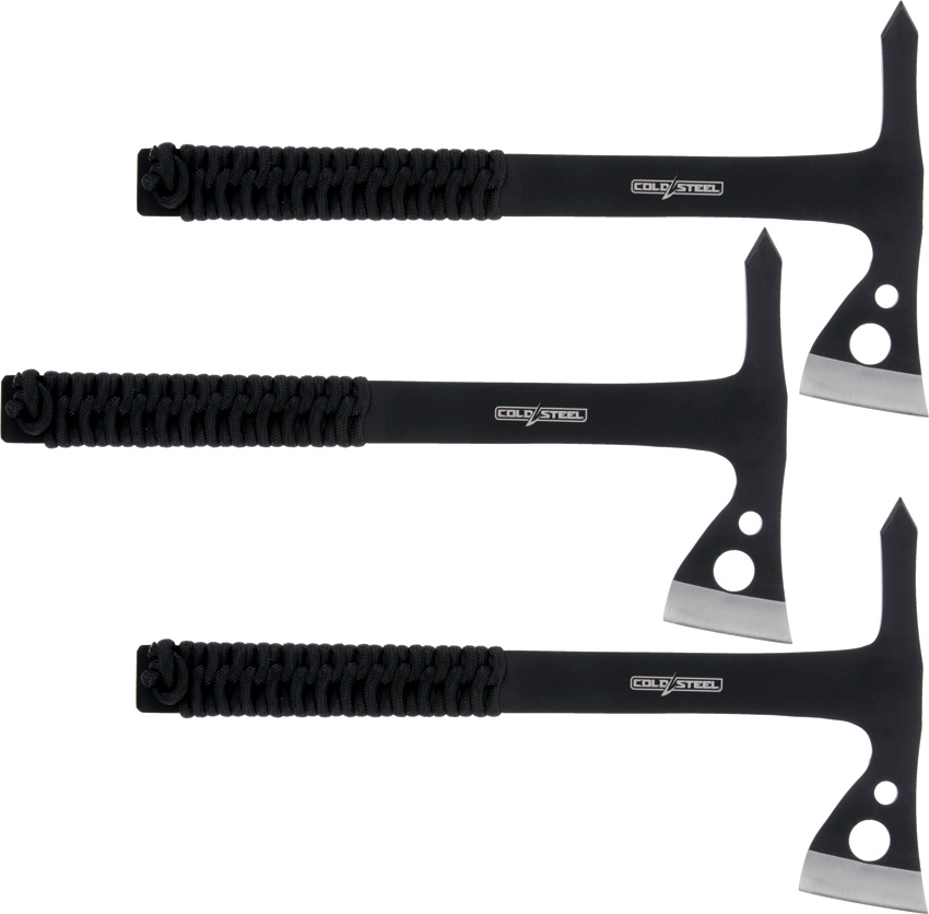 10.5″ overall. 5.5″ black TiNi coated 420 stainless axe head with 1.75″ cutting edge. Black cord wrapped handle. Set of three. Black nylon belt sheath. Clam packed.