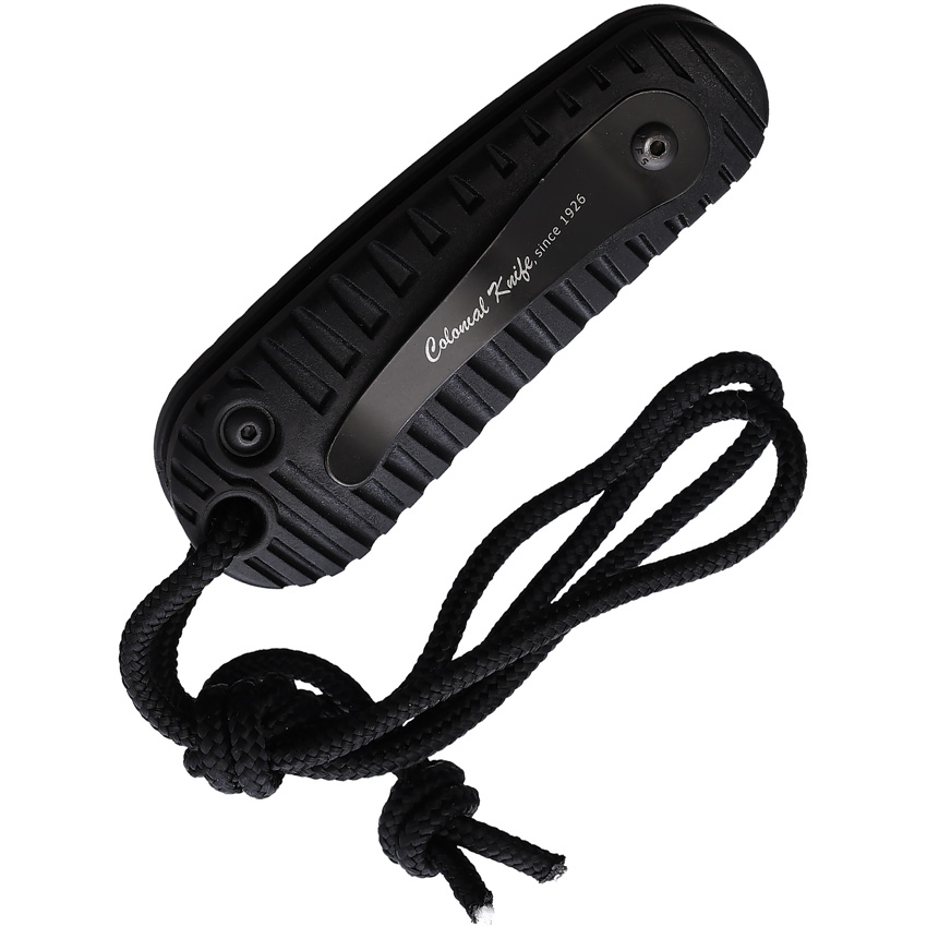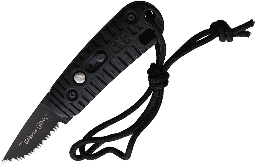 Automatic opening. 3.25″ (8.26cm) closed. 1.75″ (4.45cm) black finish serrated stainless blade. Black sculpted ABS handle. Pocket clip. Lanyard hole. Manual safety. Cord lanyard. Boxed.