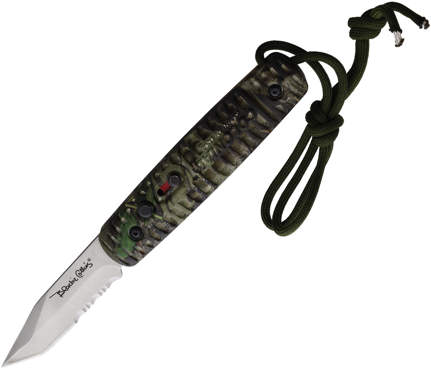 Automatic opening. 4.25″ (10.8cm) closed. 2.75″ (6.99cm) satin finish partially serrated stainless tanto blade. Mossy Oak Camo polymer handle. Pocket clip. Cord lanyard. Safety mechanism. Blackie Collins blade design. Boxed.