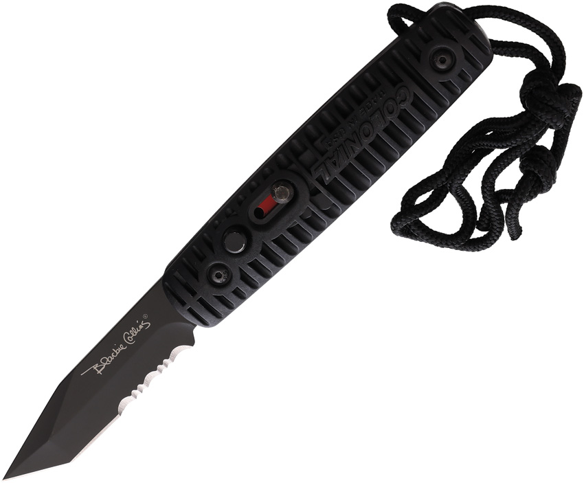 Automatic opening. 4.25″ (10.8cm) closed. 2.75″ (6.99cm) black oxide coated partially serrated stainless tanto blade. Black grooved polymer handle. Blade etching. Lanyard hole. Cord lanyard. Safety mechanism. Blackie Collins blade design. Boxed.