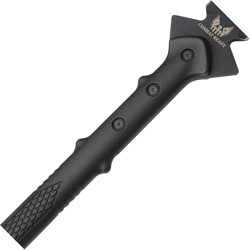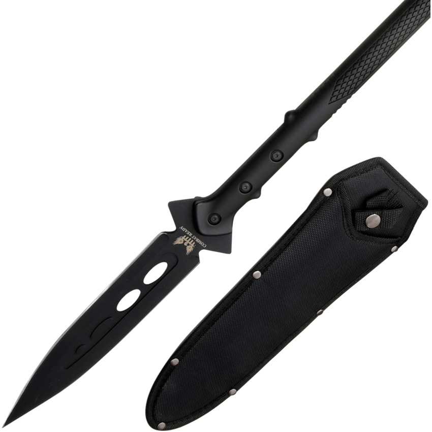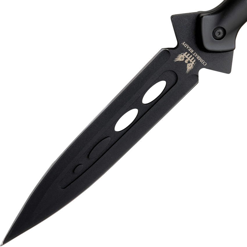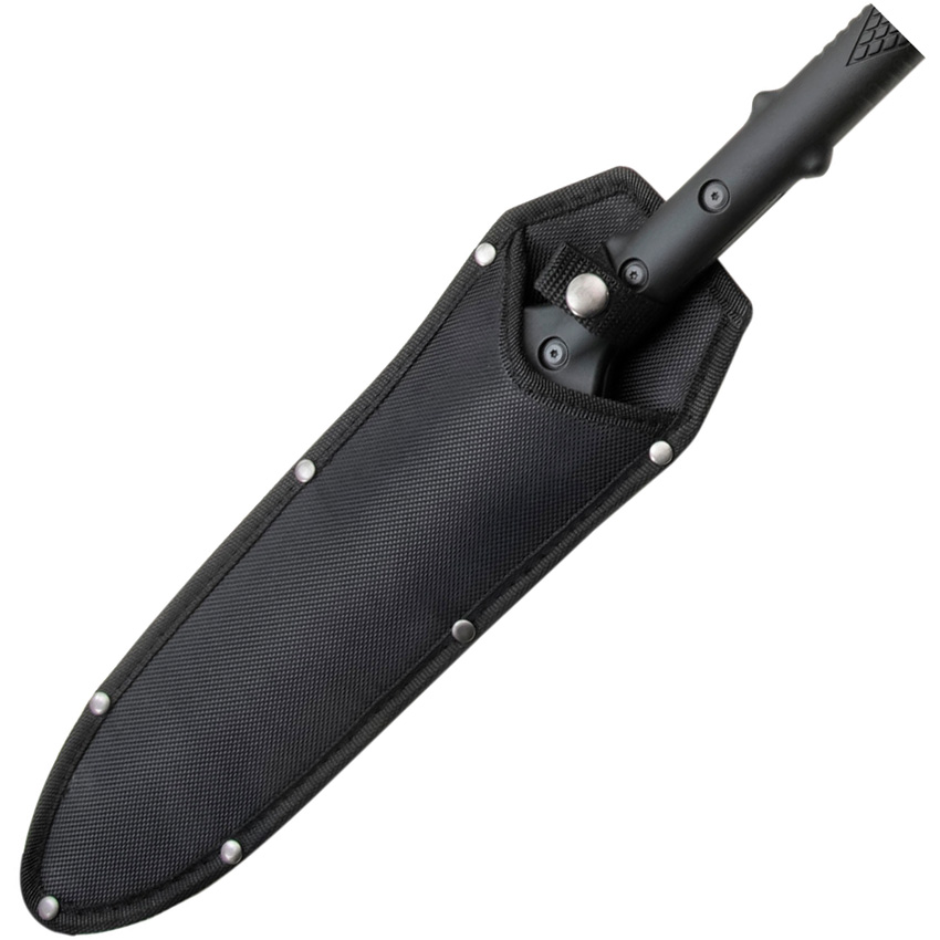 46.5″ overall. 9.5″ (24.13cm) black stonewash finish stainless blade. Black synthetic handle. Black nylon belt sheath. Gift tin.