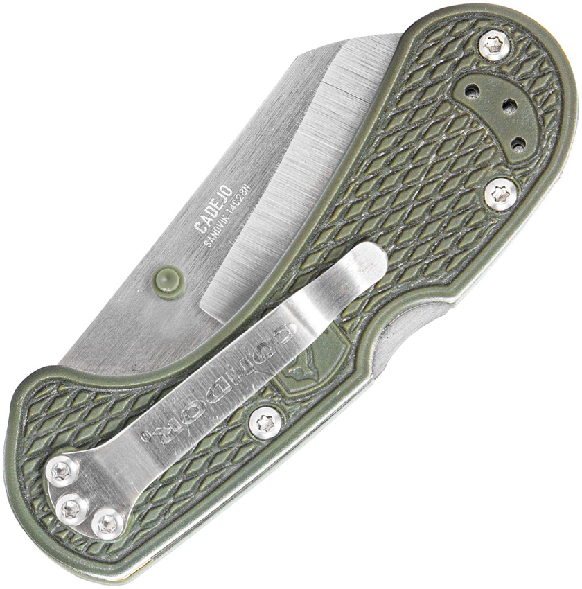 3.88″ (9.86cm) closed. 2.88″ (7.32cm) satin finish 14C28N Sandvik stainless cleaver style blade. Army green textured Zy-Ex handle. Thumb stud. Pocket clip. Boxed. No Amazon Sales Sales Restriction: No Amazon.com Sales.