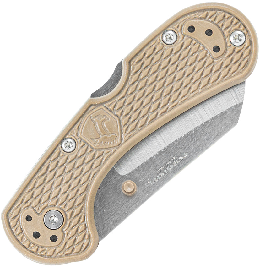 3.88″ (9.86cm) closed. 2.88″ (7.32cm) satin finish 14C28N Sandvik stainless cleaver style blade. Tan textured Zy-Ex handle. Thumb stud. Pocket clip. Boxed. No Amazon Sales Sales Restriction: No Amazon.com Sales.