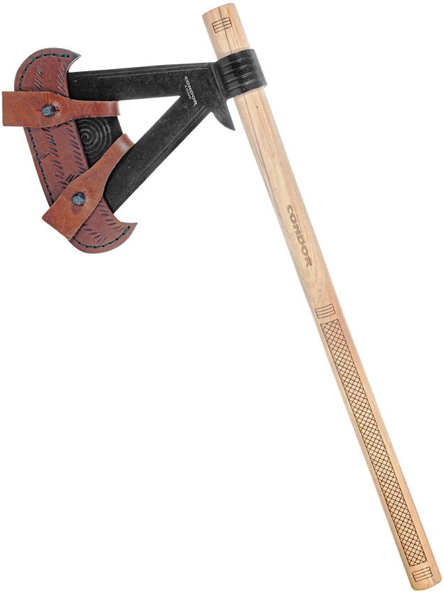 19″ overall. 7.13″ Condor classic finish 1095HC steel axe head with 5.25″ cutting edge. Burnt American Hickory handle. Brown leather sheath. Bulk packed.