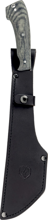 17.13″ (43.51cm) overall. 11.13″ (28.27cm) blasted satin finish convex edge 1075HC steel blade. Black canvas micarta handle. Full tang. Lanyard hole. Brown leather belt sheath. Boxed.