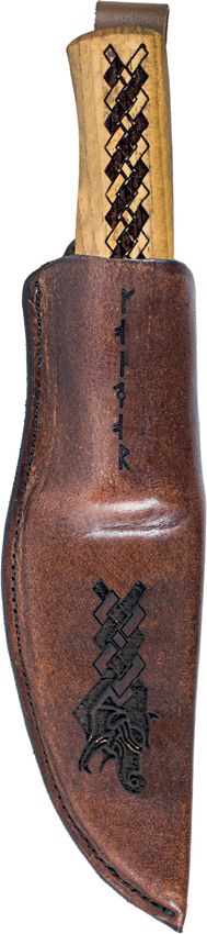 8.5″ (21.59cm) overall. 3.88″ (9.86cm) natural finish 14C28N Sandvik stainless blade. Burnt American Hickory handle. Brown leather belt sheath. Boxed. Sales Restriction: No Amazon.com Sales.