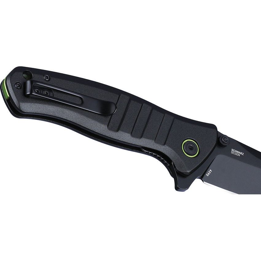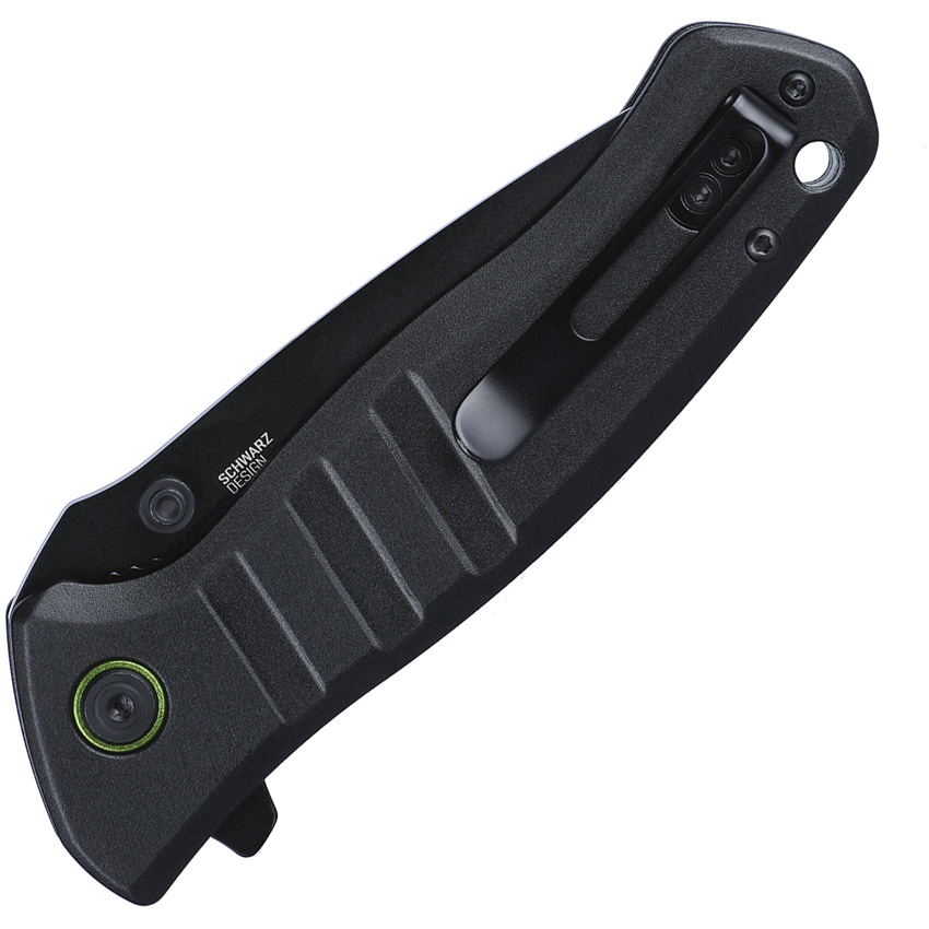 4.63″ (11.76cm) closed. 3.13″ (7.95cm) black TiNi coated D2 tool steel blade. Black aluminum handle. Thumb stud. Extended tang. Lanyard hole. Pocket clip. Boxed.