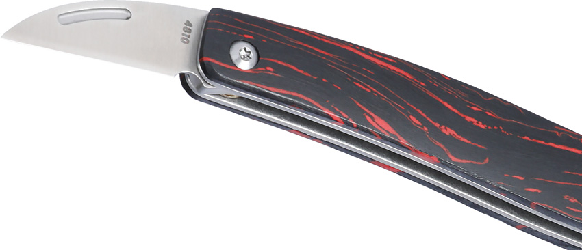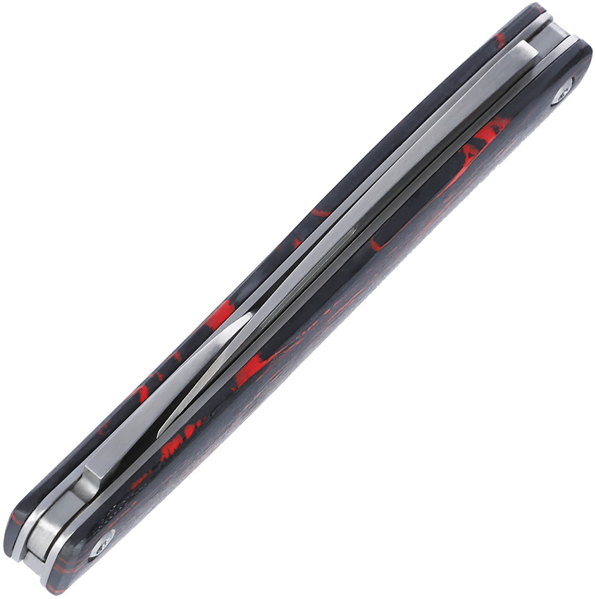3.38″ (8.59cm) closed. Satin finish 12C27 Sandvik stainless large and small Wharncliffe blades. Black and red G10 handle. Boxed.