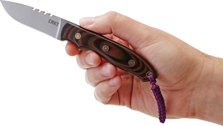 7.25″ overall. 3″ satin finish 8Cr13MoV stainless drop point blade. Black and Brown G10 handle. Full tang. Lanyard hole. Red mosaic pins. Dark purple braided cord lanyard. Includes an extra black braided cord lanyard. 100% of the net profits of this knife go to the Pancreatic Cancer Action Network in memory of Larry Fischer. Brown leather belt sheath. Designed by Larry Fischer. Boxed.