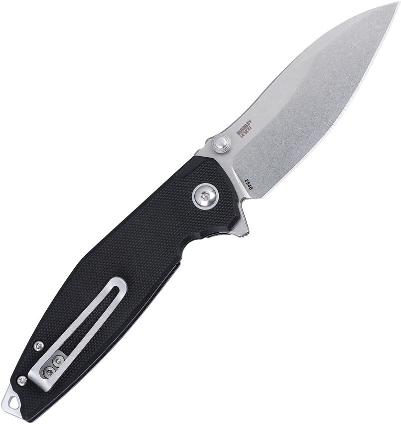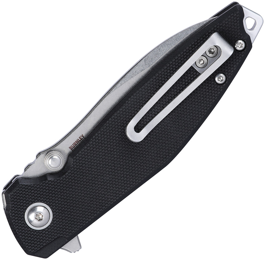 4″ (10.16cm) closed. 3″ (7.62cm) stonewash finish D2 tool steel blade. Black G10 handle. Extended tang. Thumb stud. Lanyard hole. Pocket clip. Designed by Lucas Burnley. Boxed.