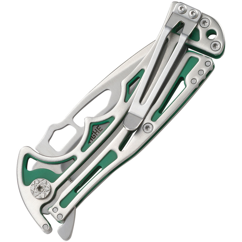 4.25″ (10.8cm) closed. 3.13″ (7.95cm) satin finish 8Cr14MoV stainless blade. Green and gray stainless handle. Extended tang. Thumb pull. Lanyard hole. Pocket clip. Designed by Brian Tighe. Boxed.