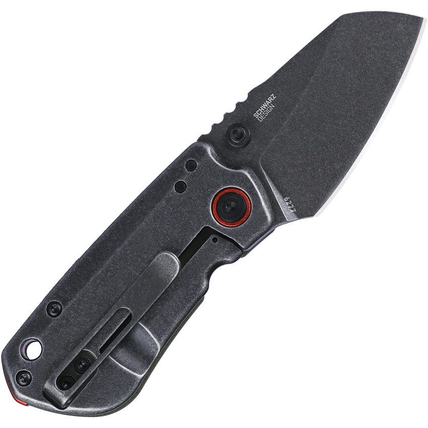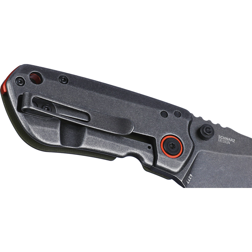 3.25″ (8.26cm) closed. 2.25″ (5.72cm) black stonewash finish D2 tool steel blade. OD green G10 handle with Black stonewash stainless back handle. Thumb stud. Lanyard hole. Pocket clip. Boxed.