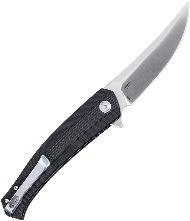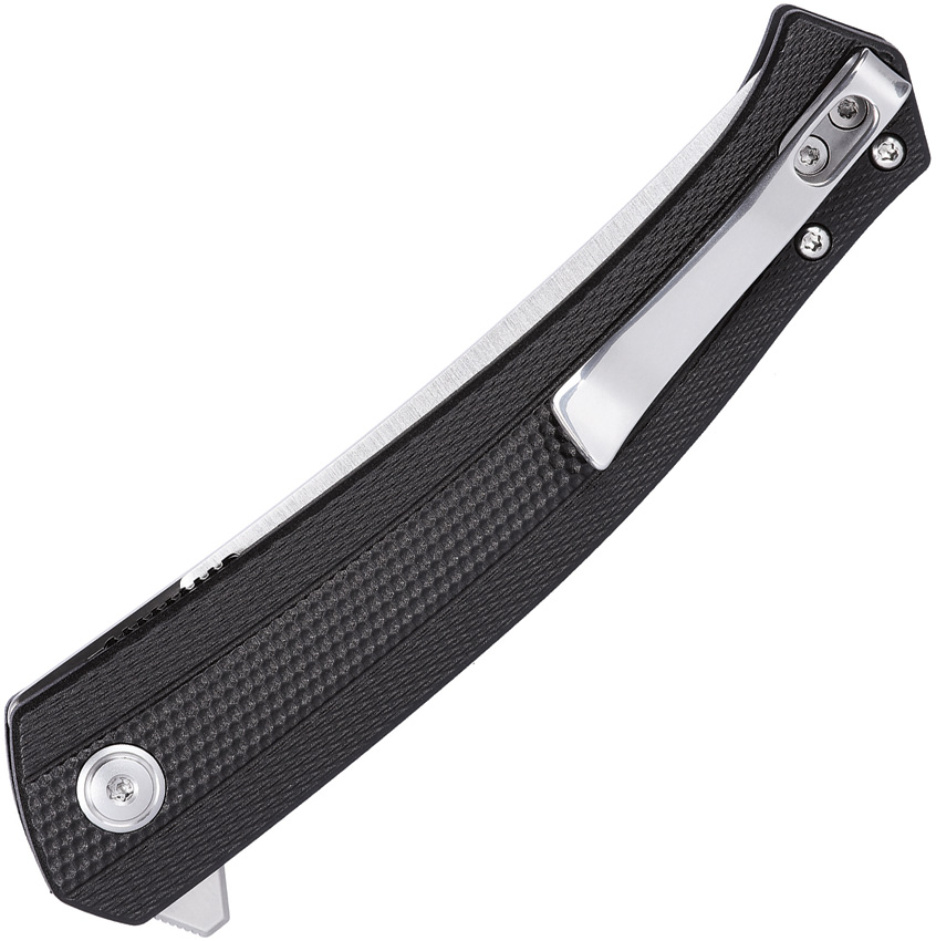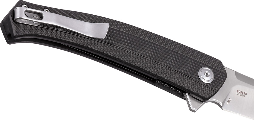Assisted opening. 4.5″ (11.43cm) closed. 3.5″ (8.89cm) satin finish D2 tool steel blade. Black GRN handle. Extended tang. Pocket clip. Boxed.
