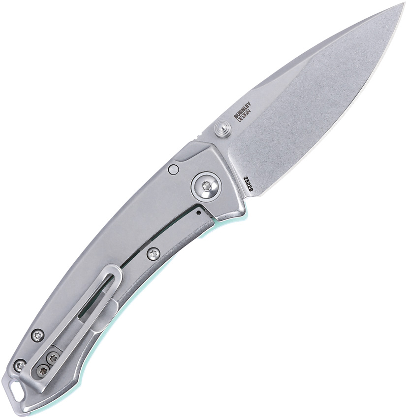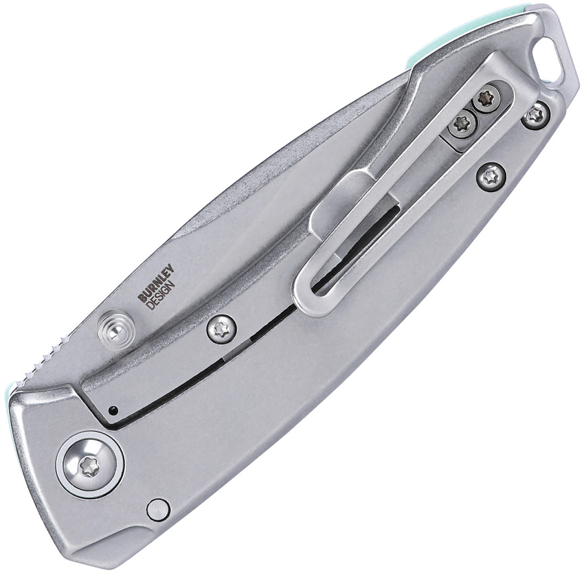3.88″ (9.86cm) closed. 2.75″ (6.99cm) stonewash finish 14C28N Sandvik stainless blade. Aqua blue G10 handle with stonewash finish stainless back handle. Thumb stud. Lanyard hole. Pocket clip. Designed by Lucas Burnley. Boxed.