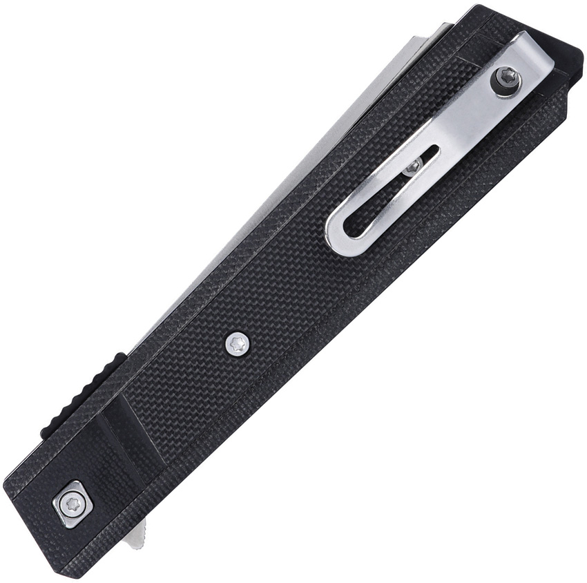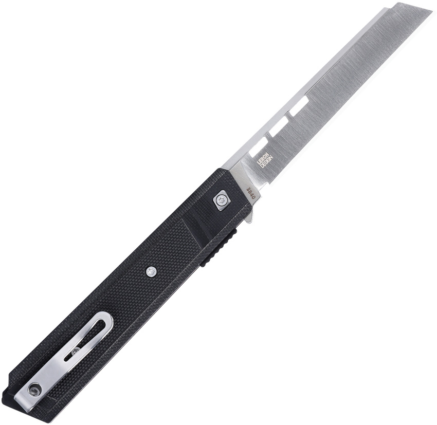 4″ (10.16cm) closed. 3.25″ (8.26cm) satin finish D2 tool steel reverse tanto blade. Black G10 handle. Extended tang. Pocket clip. Boxed.