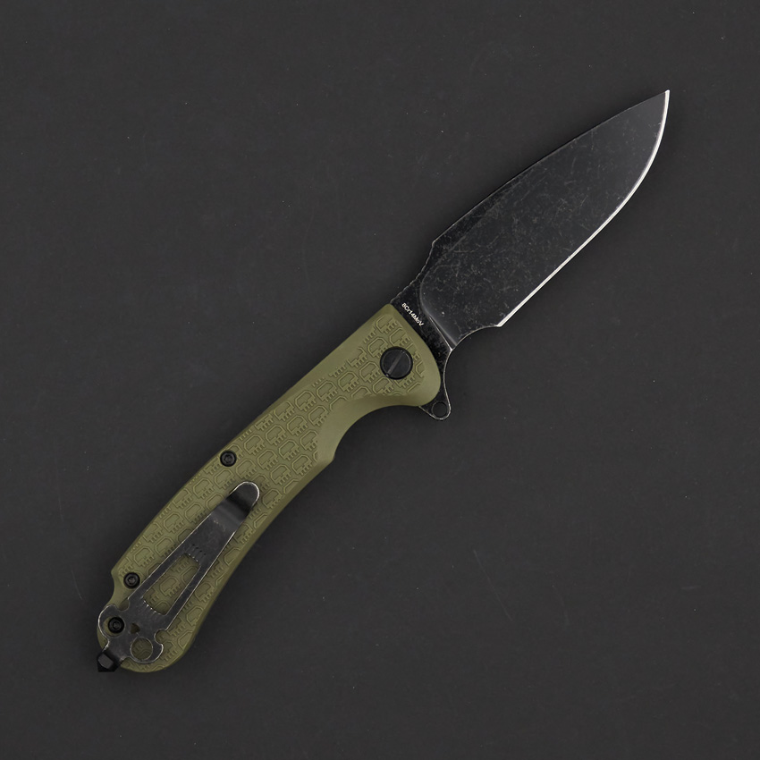 4.63″ (11.76cm) closed. 3.5″ (8.89cm) black stonewash finish 8Cr14MoV stainless blade. Olive textured FRN handle. Extended tang. Glass breaker. Pocket clip. Boxed.