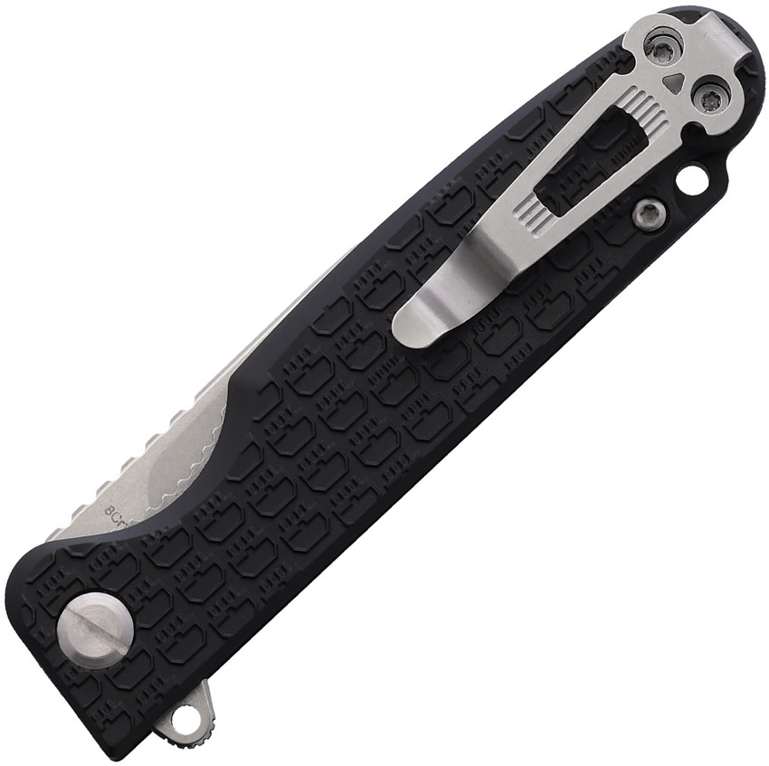 3.88″ (9.86cm) closed. 2.88″ (7.32cm) stonewash finish 8Cr14MoV stainless clip point blade. Black textured FRN handle. Extended tang. Lanyard hole. Pocket clip. Boxed.