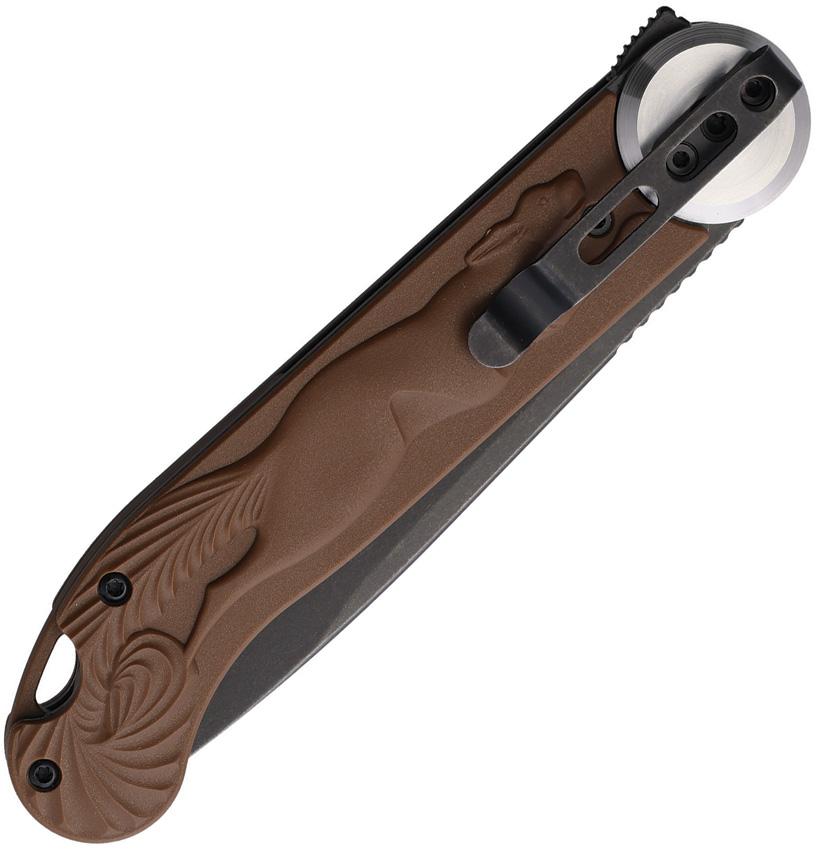 4.88″ (12.4cm) closed. 3.75″ (9.53cm) black stonewash finish stainless blade. Brown sculpted ABS handle. Thumb disk. Pocket clip. Fox relief handle artwork. Boxed.