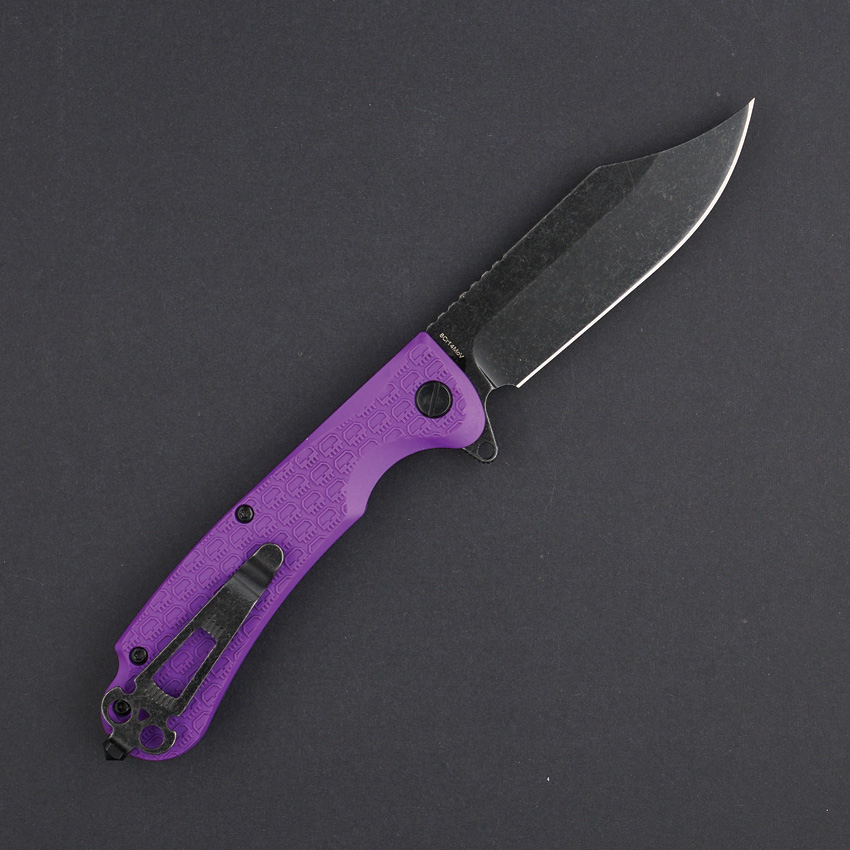 4.5″ (11.43cm) closed. 3.25″ (8.26cm) black stonewash finish 8Cr14MoV stainless clip point blade. Purple textured ABS handle. Extended tang. Glass breaker. Pocket clip. Lanyard hole. Boxed.