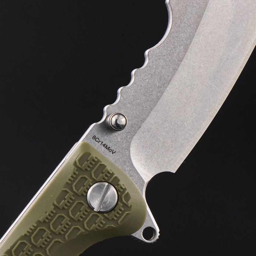 4.63″ (11.76cm) closed. 3.5″ (8.89cm) stonewash finish 8Cr14MoV stainless sheepsfoot blade. Olive textured FRN handle. Extended tang. Glass breaker. Pocket clip. Thumb stud. Boxed.