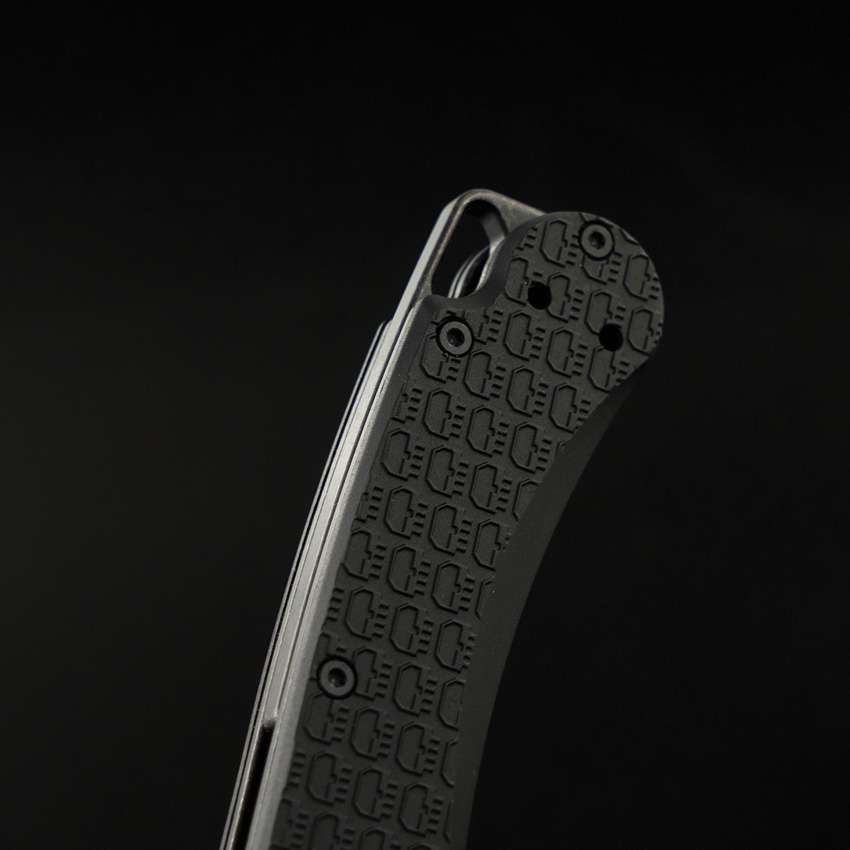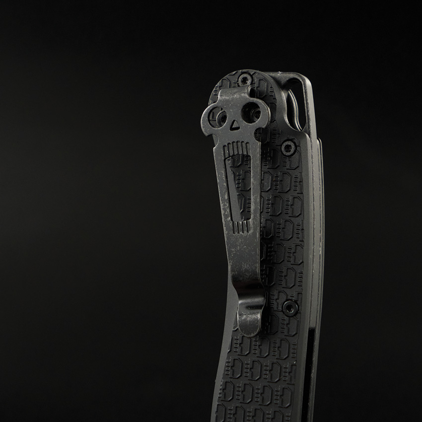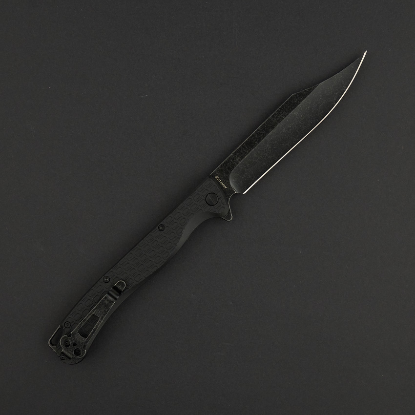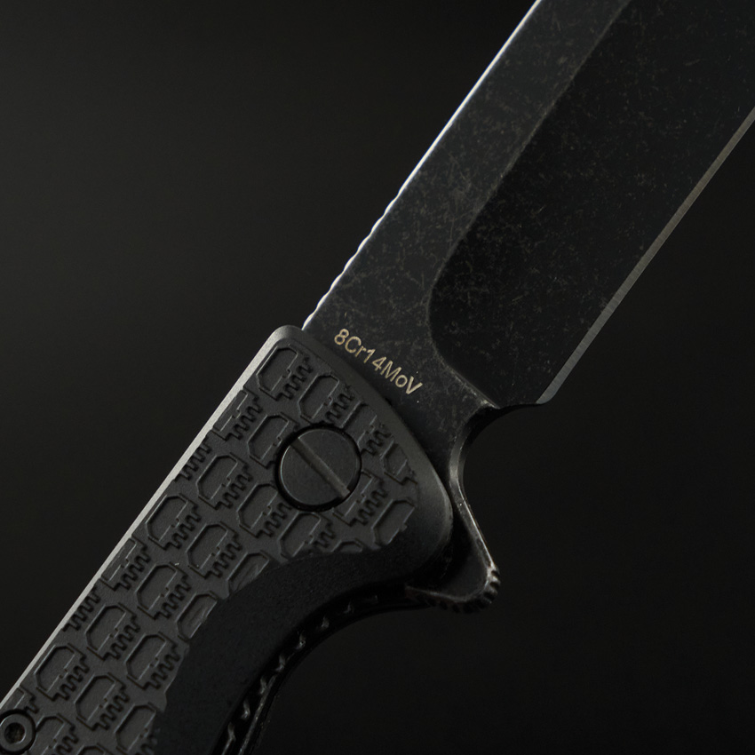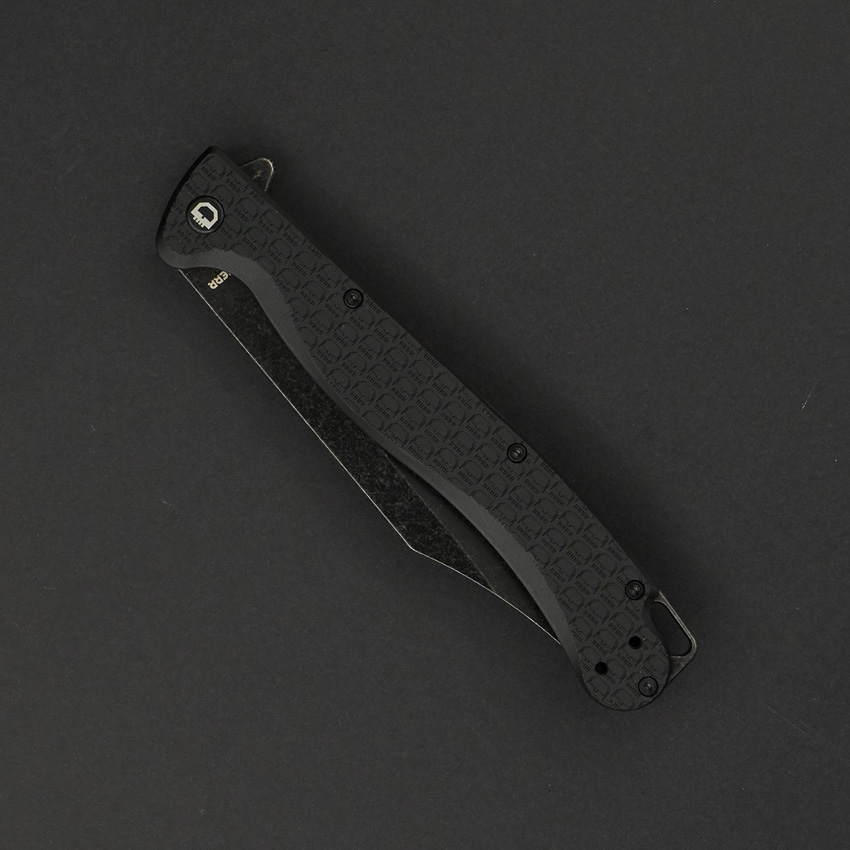 5.88″ (14.94cm) closed. 4.88″ (12.4cm) black stonewash finish 8Cr14MoV stainless clip point blade. Black textured FRN handle. Extended tang. Lanyard hole. Pocket clip. Boxed.