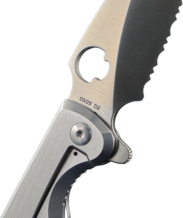 4.75″ (12.07cm) closed. 3.88″ (9.86cm) satin finish serrated D2 tool steel spear point blade. Brushed stainless handle. Extended tang. Thumb pull. Lanyard hole. Pocket clip. Boxed.
