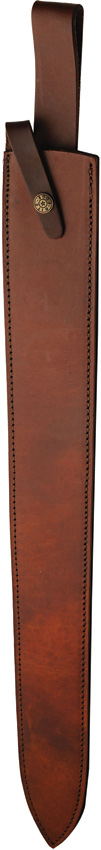 29.75″ (75.57cm) overall. 23″ (58.42cm) Damascus steel blade. Black leather wrapped handle. Brass guard and pommel. Brown leather sheath. Boxed.