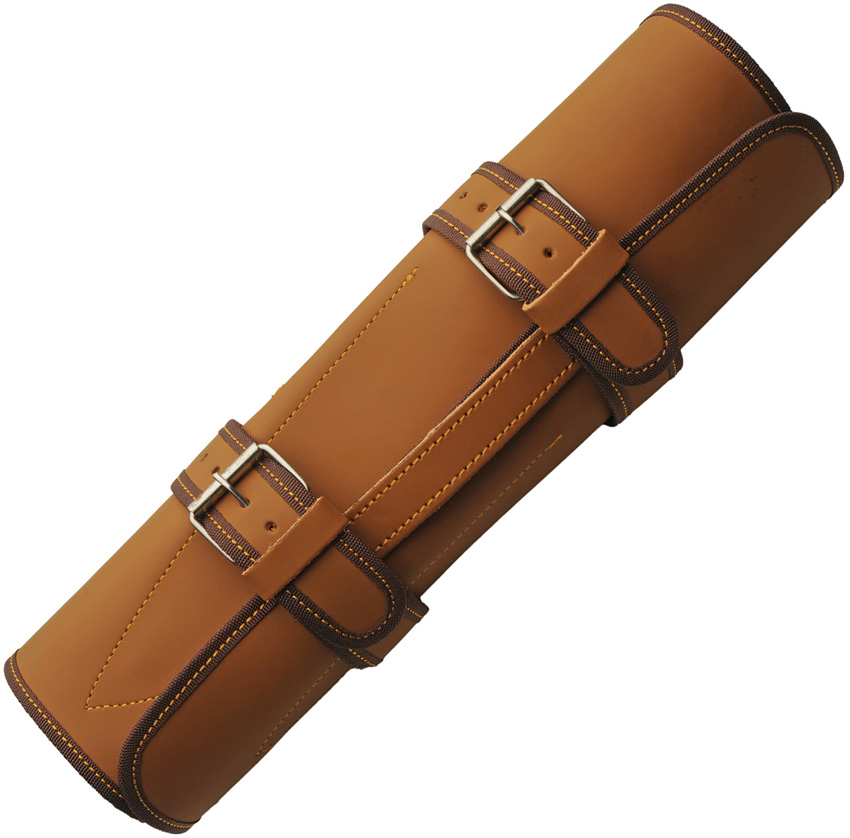 Damascus steel blade. Brown and black wood handle. Full tang. Includes: 12.5″ Chef’s; 11″ Utility; 11″ Santoku; 12.25″ Fillet; 11.25″ Cleaver; Knife roll. Boxed.