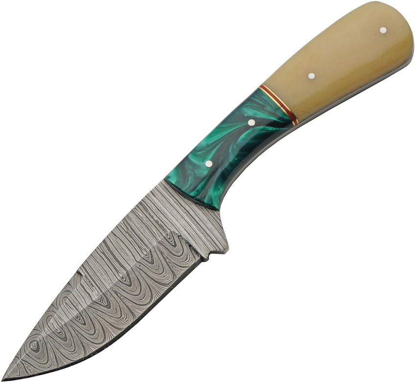 8.5″ (21.59cm) overall. 4″ (10.16cm) Damascus steel blade. Full tang. Camel bone and green acrylic handle. Brown leather belt sheath. Boxed.
